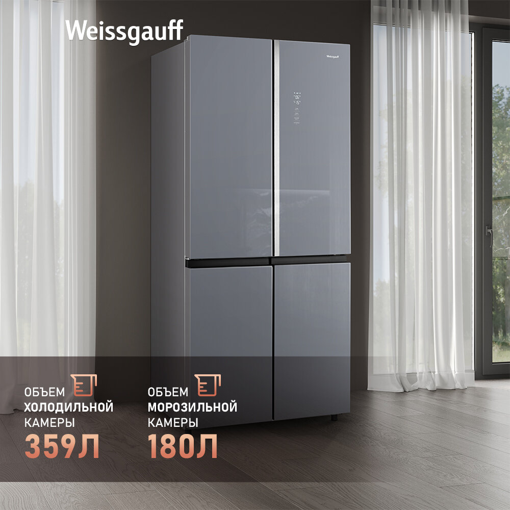 Отдельностоящий холодильник с инвертором Weissgauff WCD 590 Nofrost Inverter Premium Ecofresh Dark Grey Glass 3 года гарантии, CrossDoor, суперзаморозка, суперохлаждение, технология Multi Air Flow и Metal-Tech Cooling, LED-освещение 112 025 ₽