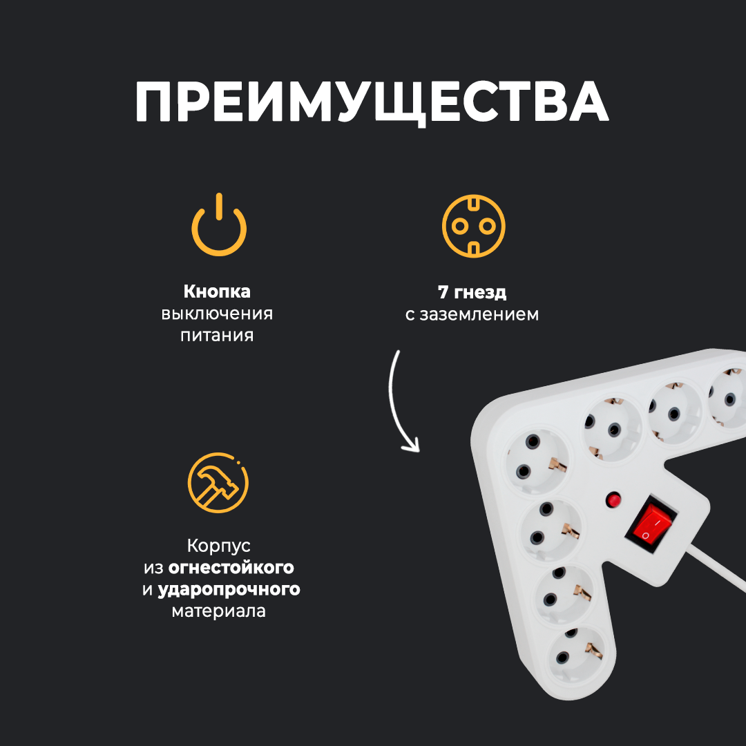 Удлинитель сетевой фильтр PG 7 гнезд / розеток, 3 метра, с заземлением, с выключателем, белый, 10 А, 2000 Вт, без USB, 3 м 960 ₽