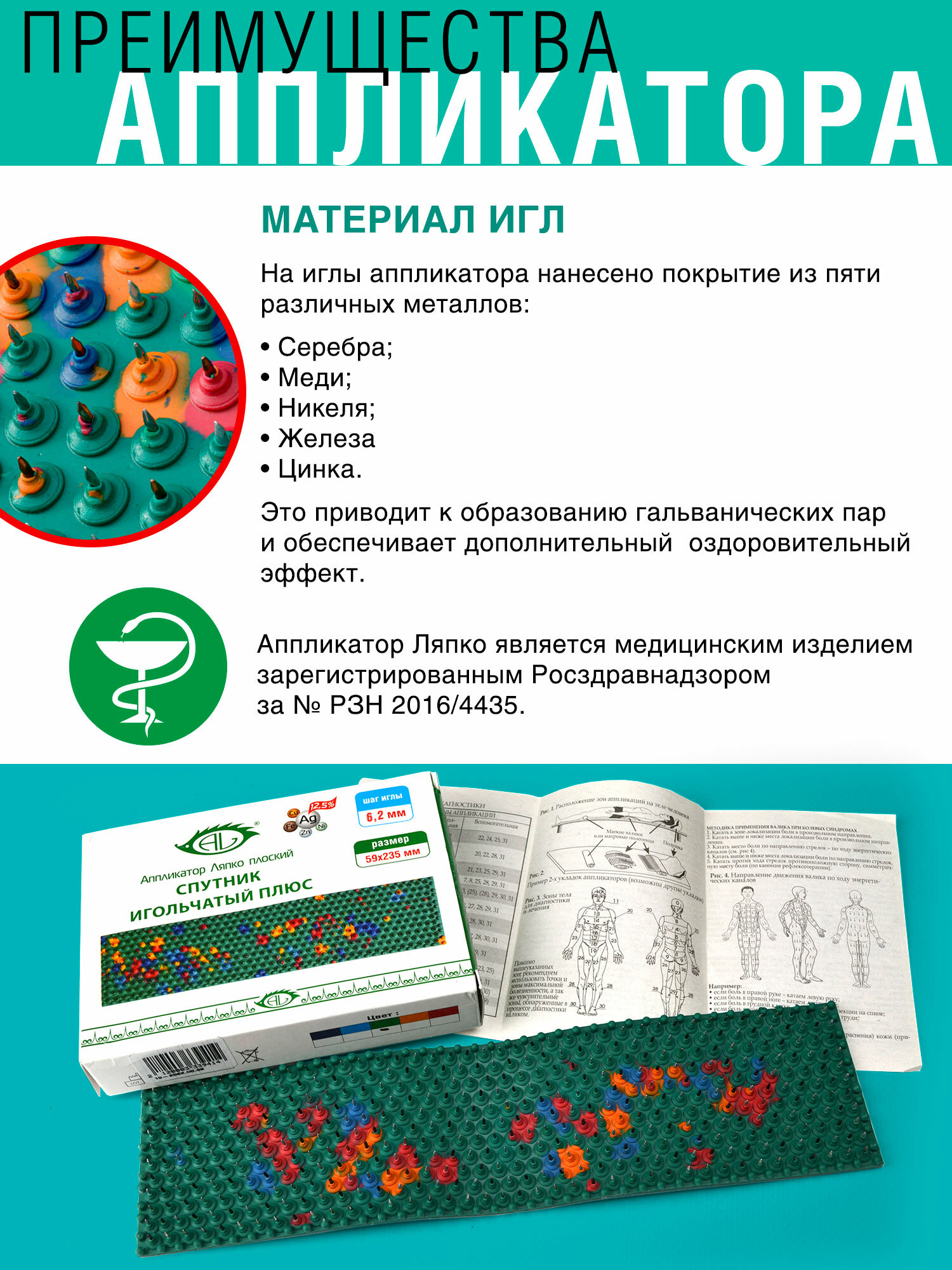 Массажный коврик Ляпко Спутник-плюс 6,2 (23.5x5.9 см), шаг игл 6.2 мм, в ассортименте информация: