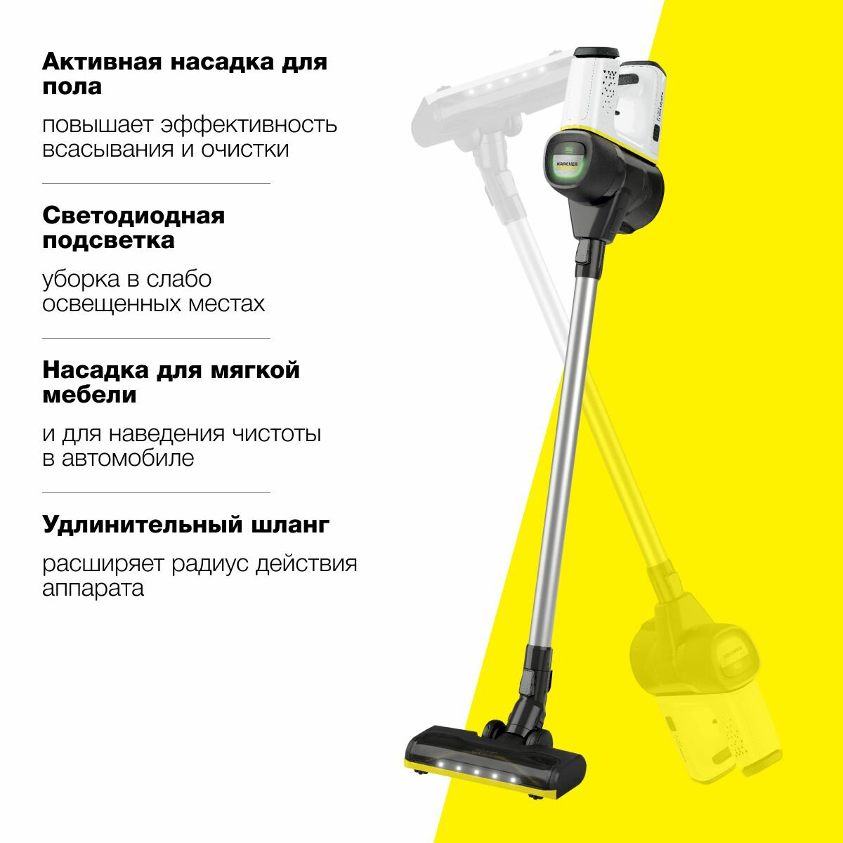 10 цен на Пылесос вертикальный беспроводной Karcher VC 6 Cordless ourFamily Pet 1.198-673.0, режим Boost, безмешковая система фильтрации, подсветка, время автономной работы до 50 мин, белый