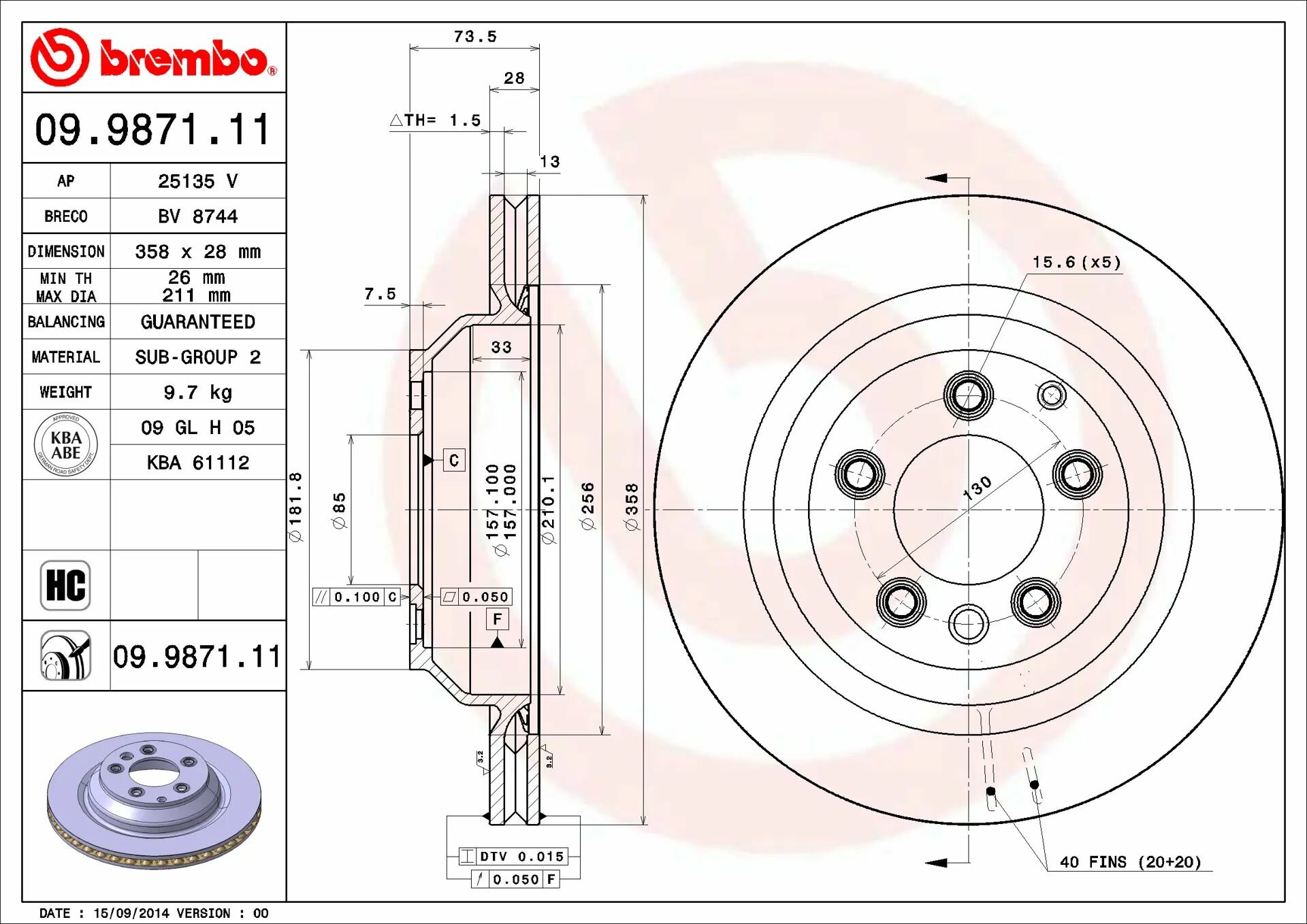 BREMBO 09.9871.11 Диск торм. зад.вент.[358x28] 5 отв