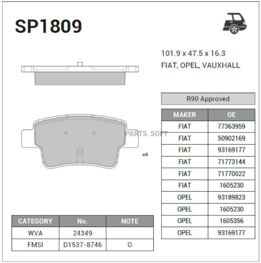 Тормозные колодки задние SP1809 для Fiat Grande Punto 1.4/1.6D/1.9D 2005>, Opel Corsa D 2006>