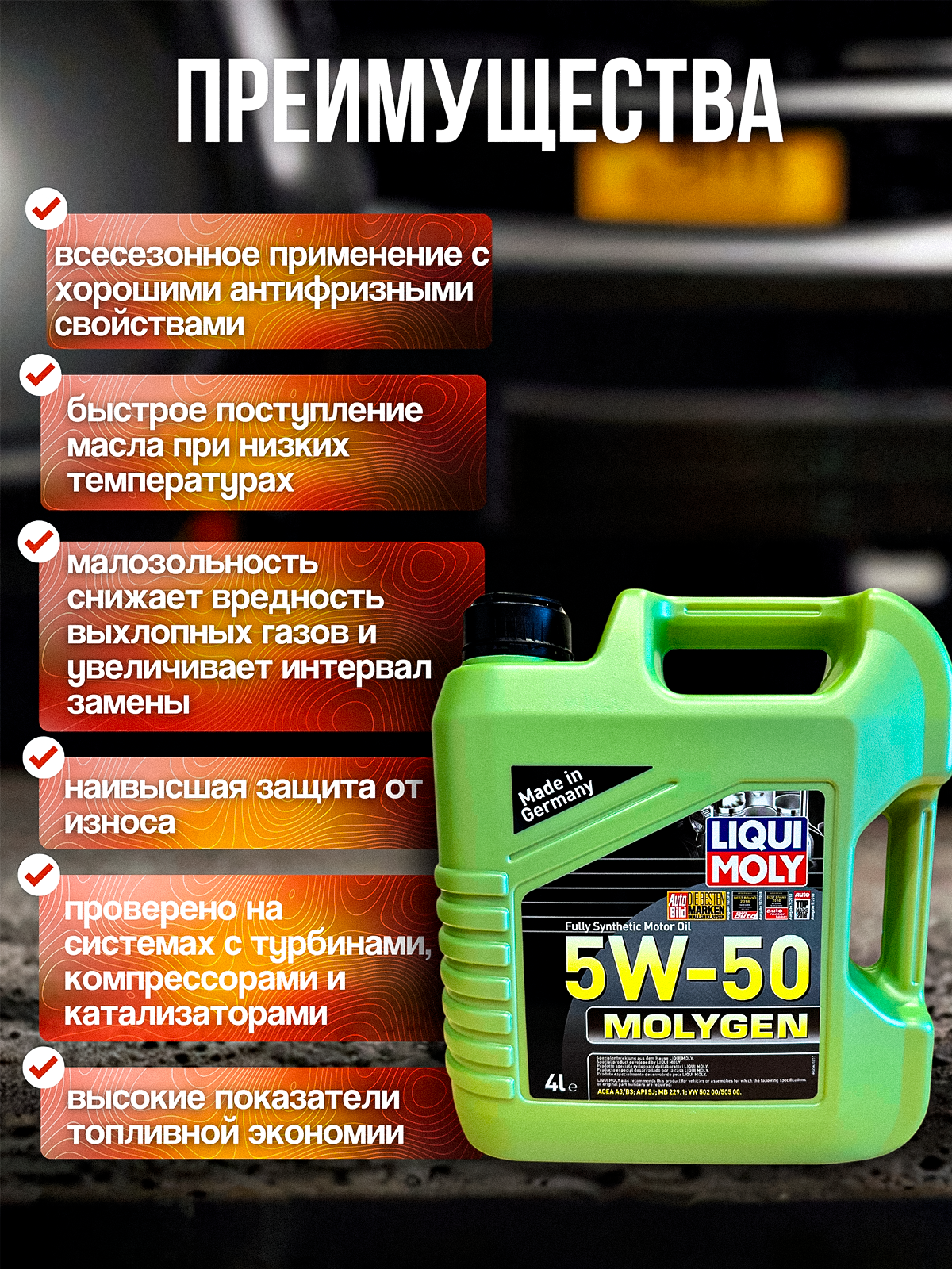 Моторное масло "LIQUI MOLY MOLYGEN", синтетическое, 5W-50, 4л, для бензиновых и турбированных движков. 2543. информация: