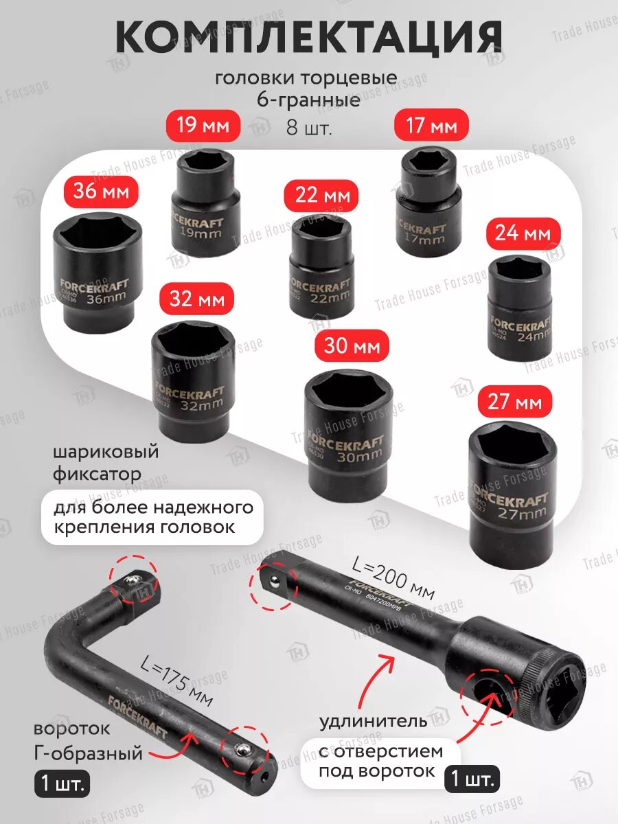 | Головки торцевые подробно | 6-гранные: 17, 19, 21, 22, 24, 27, 30, 32, 33, 34, 35, 38, 41, 46, 50 мм; 12-гранные: 36 мм |