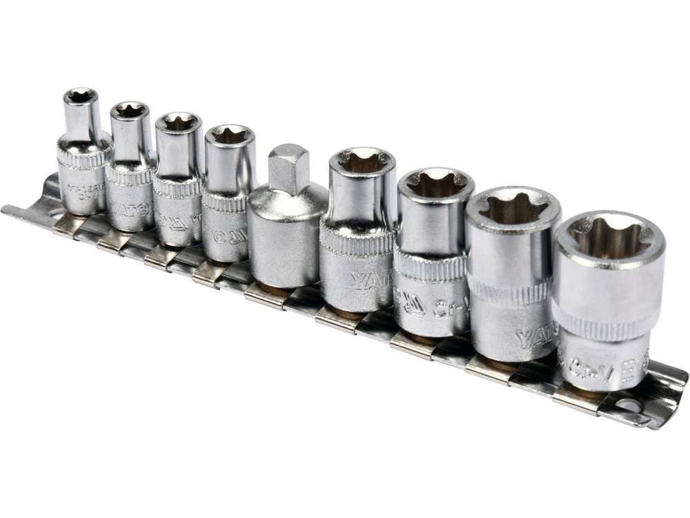 YATO YT-0520 Набор головок торцевых, 9 пр Е-профиль: 1/4 inch: Е5-Е8, 3/8 inch: E10, E12, E14, E16, переходник 1/4(М) х 3/8(F), блистер