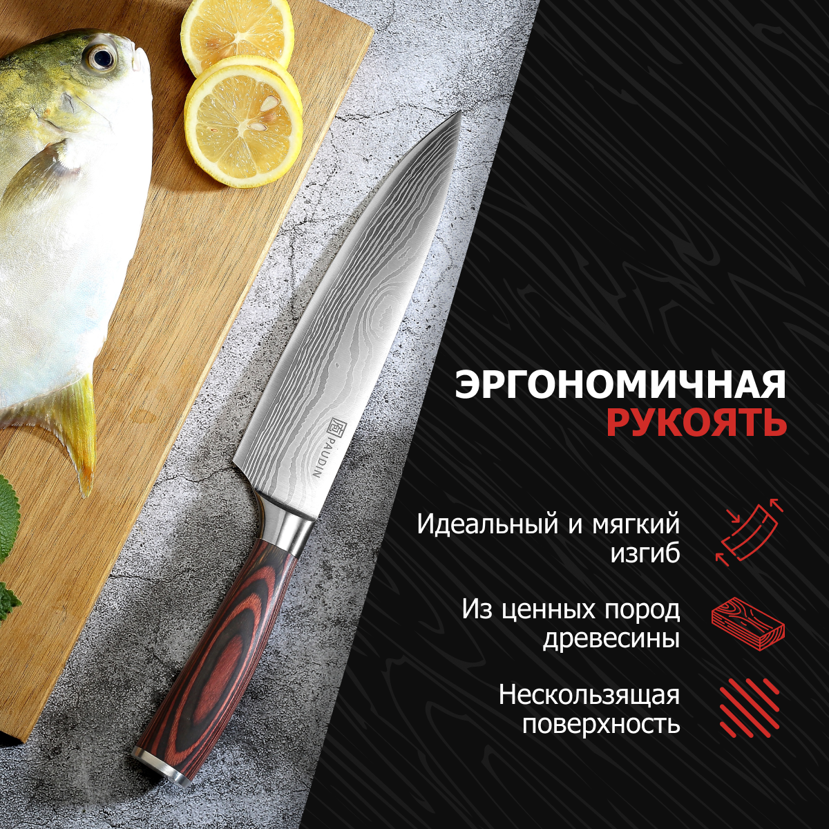 PAUDIN Pro Нож кухонный профессиональный шеф повара разделочный слайсер для мяса рыбы и овощей фруктов лезвие 20 см
