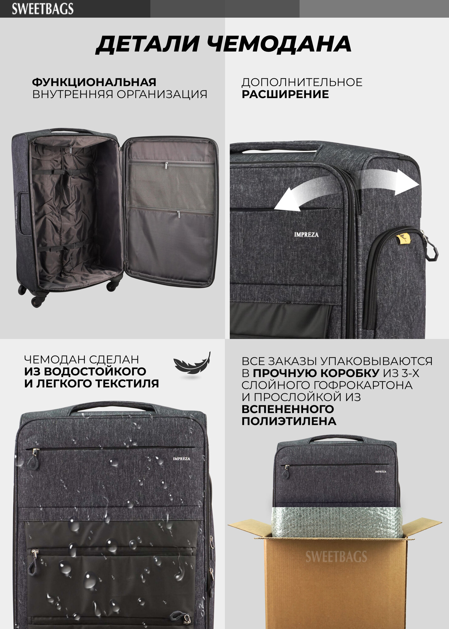 Чемодан Sweetbags текстильный средний с 4 съемными колесами и расширением (waterproof) темно-серый M+ 8 290 ₽