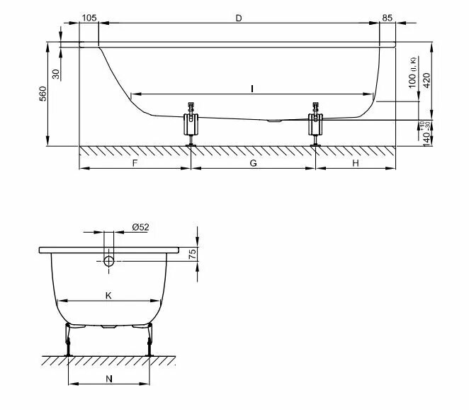 Ванна Gamma 140х70 см, акриловая, на каркасе, экран к ванне Gamma 140