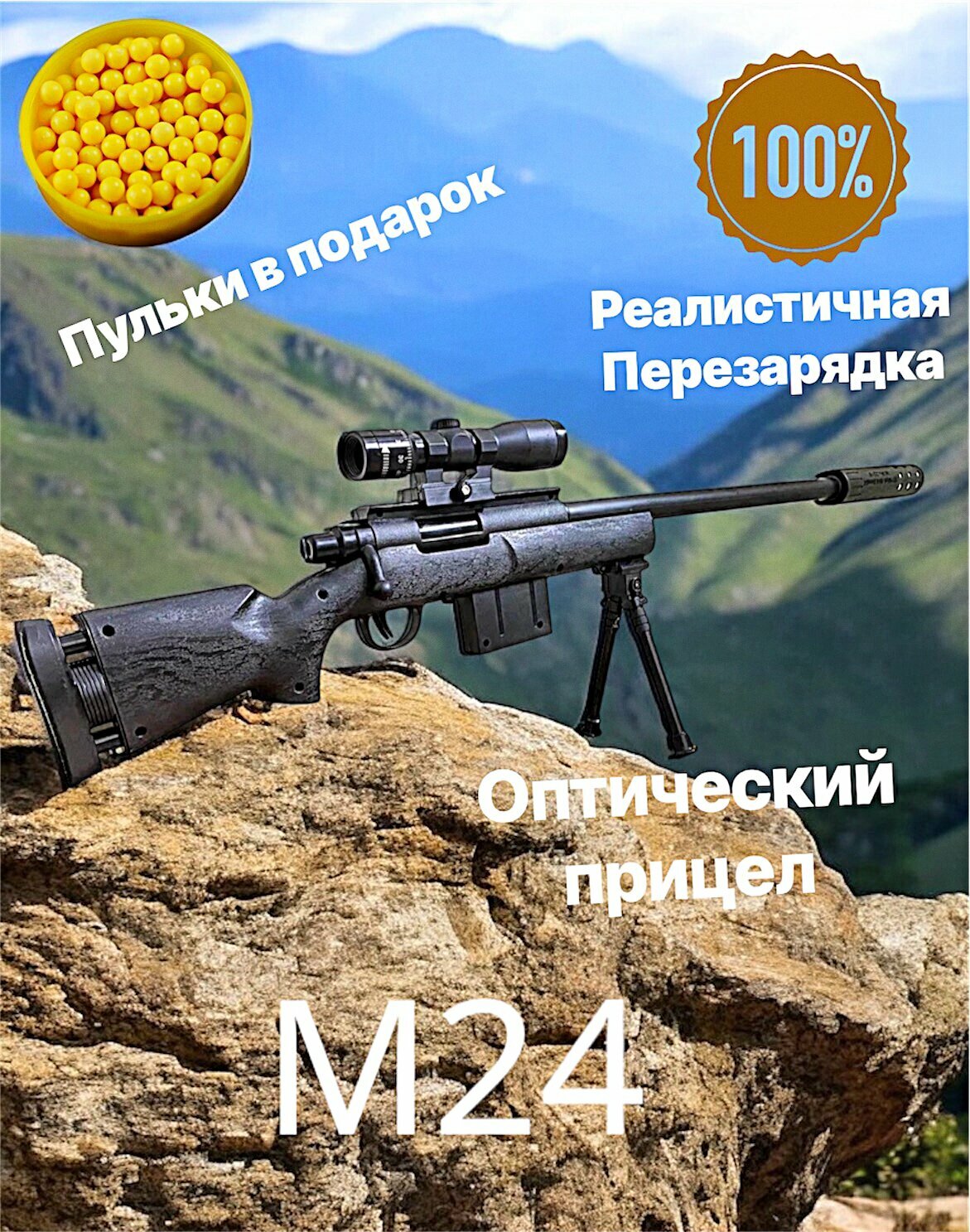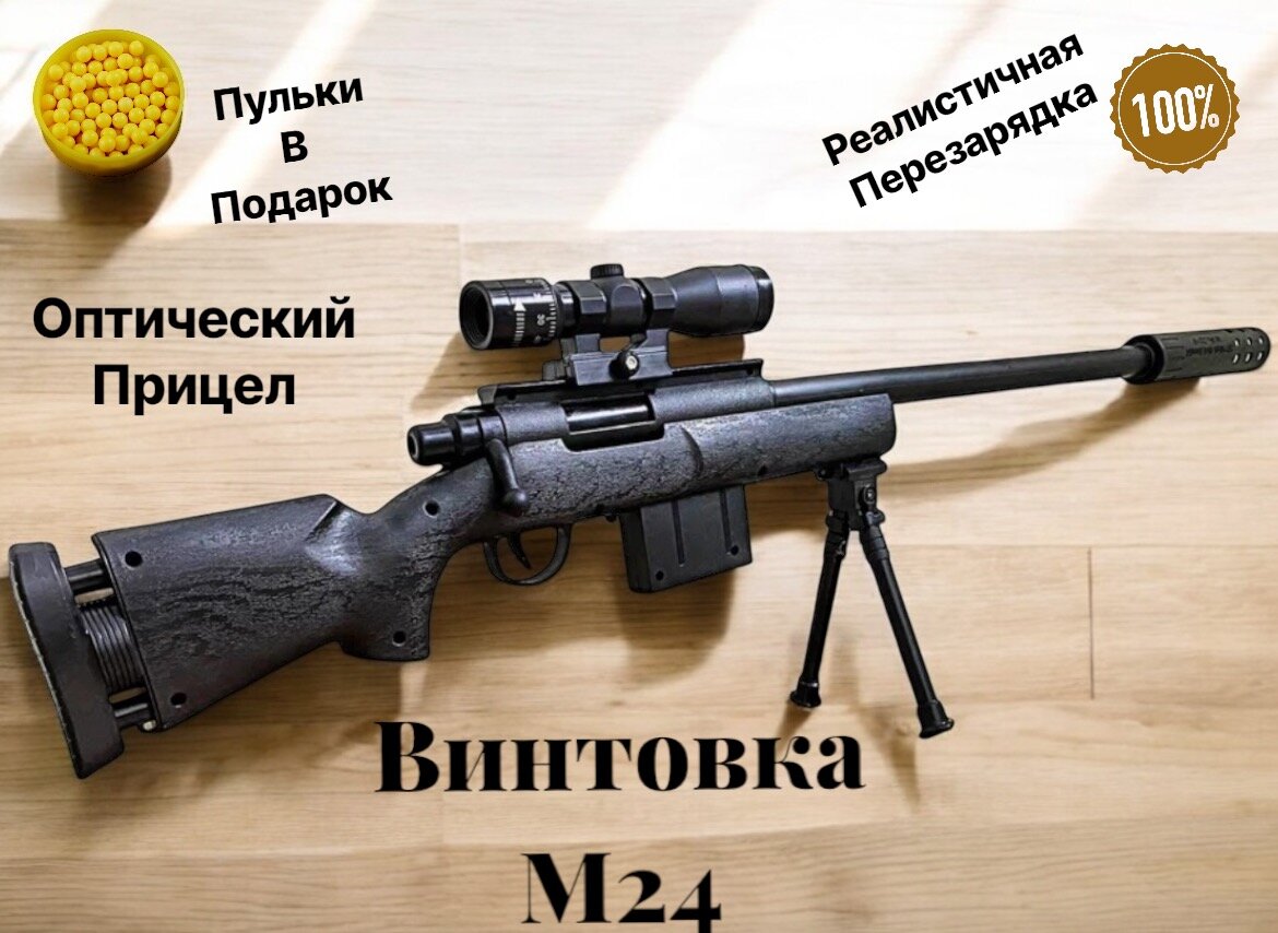 Отзывы на Детская снайперская пневматическая винтовка М24 (BLACK) с оптическим прицелом и глушителем (82 см)