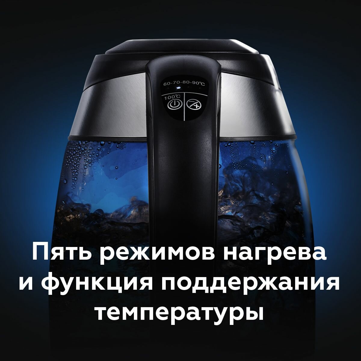 Особенности | вращение на 360 градусов / индикатор уровня воды / индикация включения / отсек для хранения шнура / фильтр / 5 режимов нагрева (от 60°C до 100°C) / Функция поддержания температуры / 5 цветов LED-подсветки / отсек для хранения электрошнура / кнопка открытии крышки / съемный фильтр от накипи |