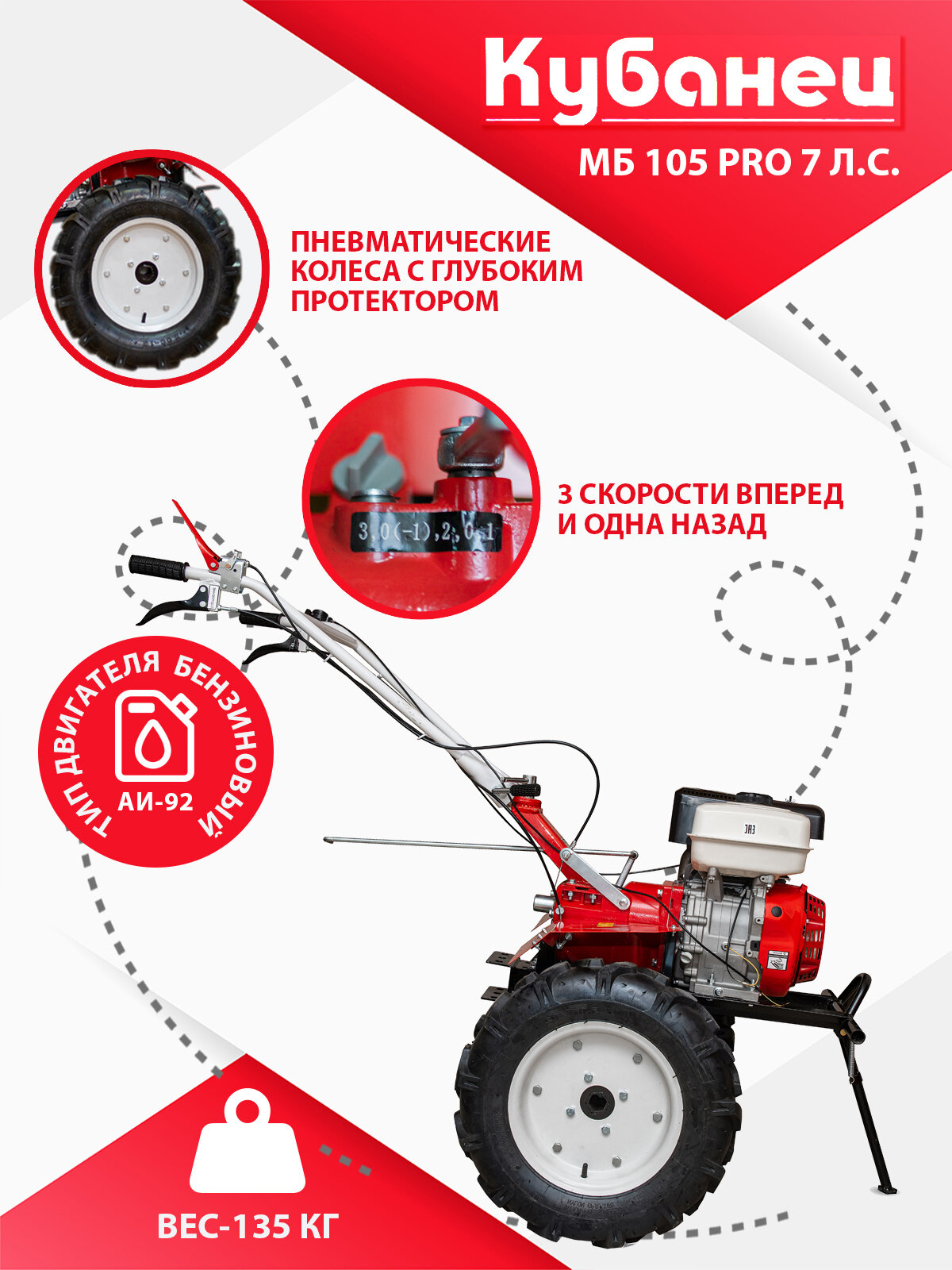 10 цен на Мотоблок бензиновый двигатель КУБанец культиватор садовая техника МБ 105 PRO с колесами 7 л. с, 3 скорости вперед, 1 назад
