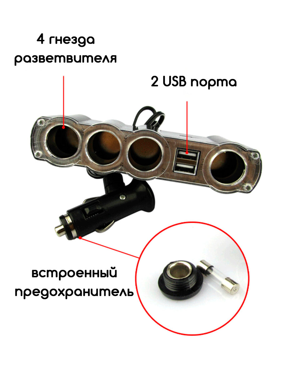 Разветвитель прикуривателя автомобиля 4 входа с USB, зарядное устройство 12В и 24В, зарядка для телефона информация: