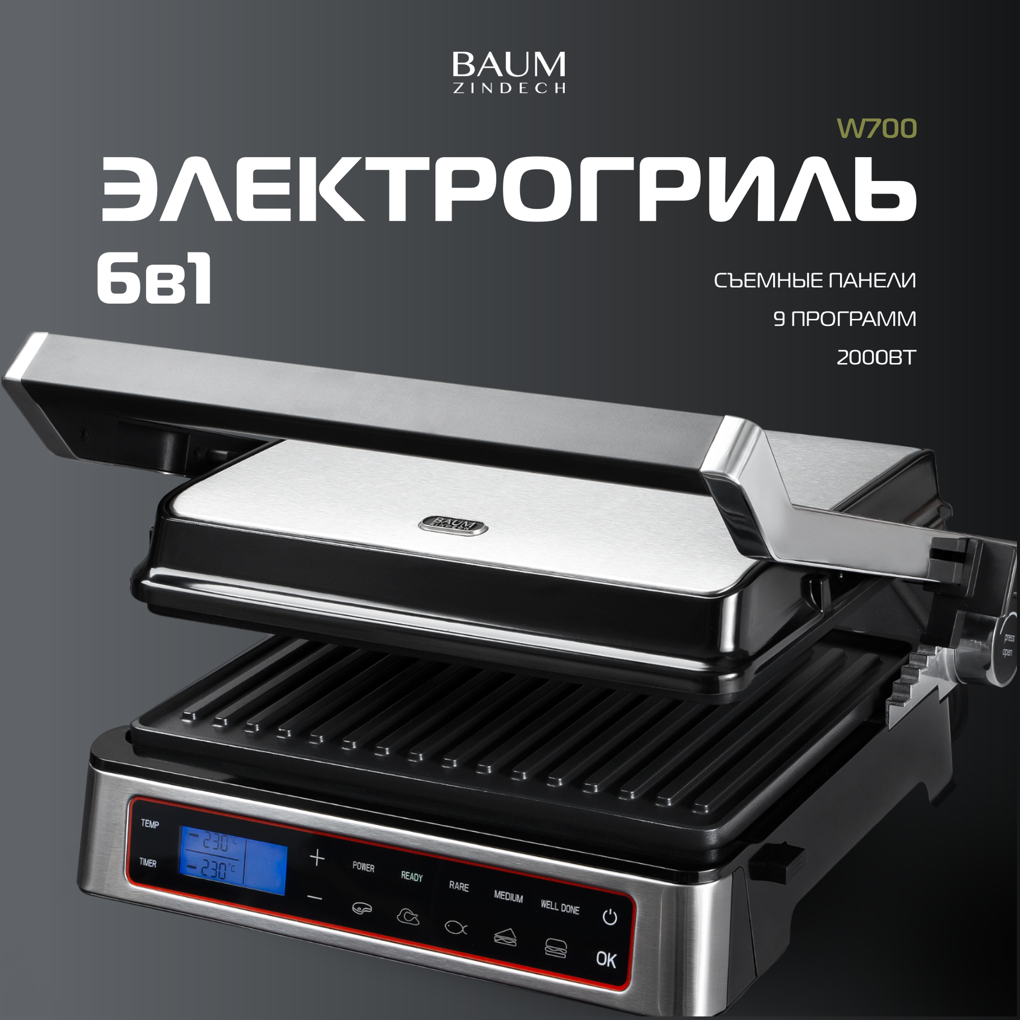 Гриль электрический BAUM ZINDECH W700 для приготовления блюд, электрогриль со съёмными панелями информация: