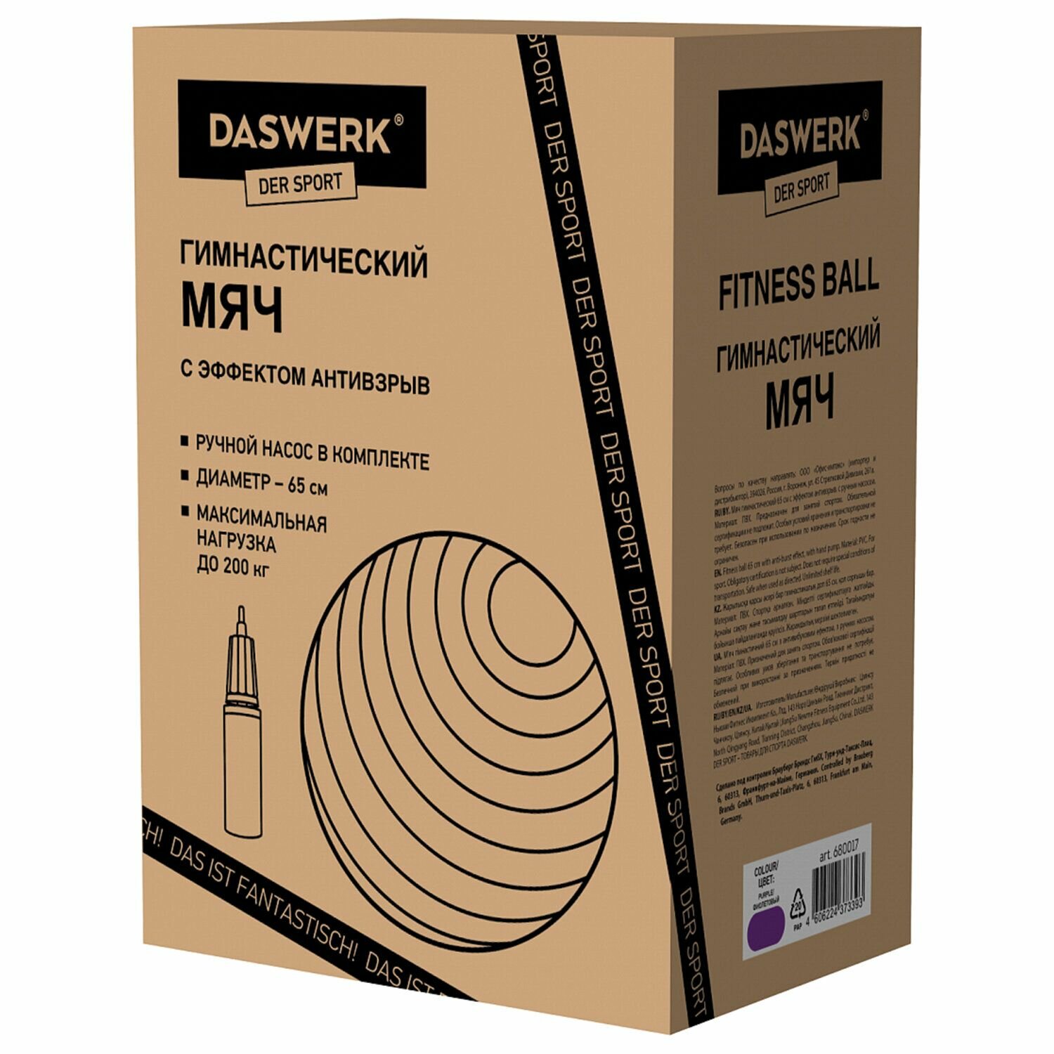 Гимнастический мяч DASWERK фитбол, 65 см, с эффектом Антивзрыв, с ручным насосом, фиолетовый (680017) информация: