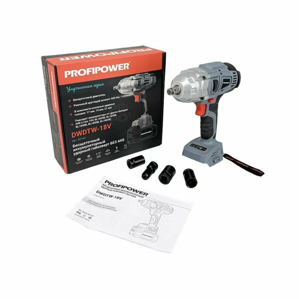 10 цен на Аккумуляторный гайковерт бесщеточный ударный ProfiPower DWDTW-18V, без АКБ и ЗУ, 600Нм, набор головок 17/19/21мм