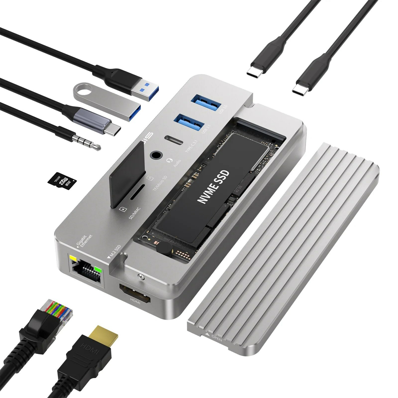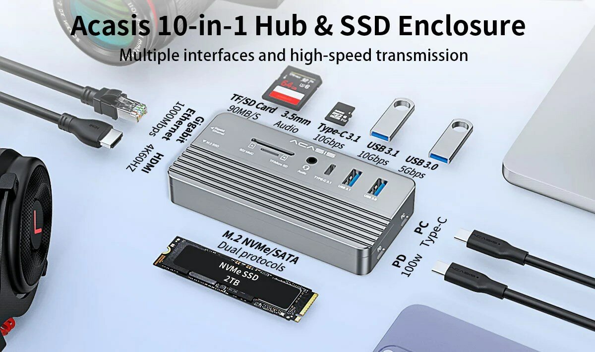 10 цен на Док-станция 10-в-1 USB Type-C -> 1xUSB 3.0+1xUSB 3.1Gen2+1xType-C+HDMI+LAN-G+PD100W+audio+CR+M.2 NVME/SATA ACASIS CM073