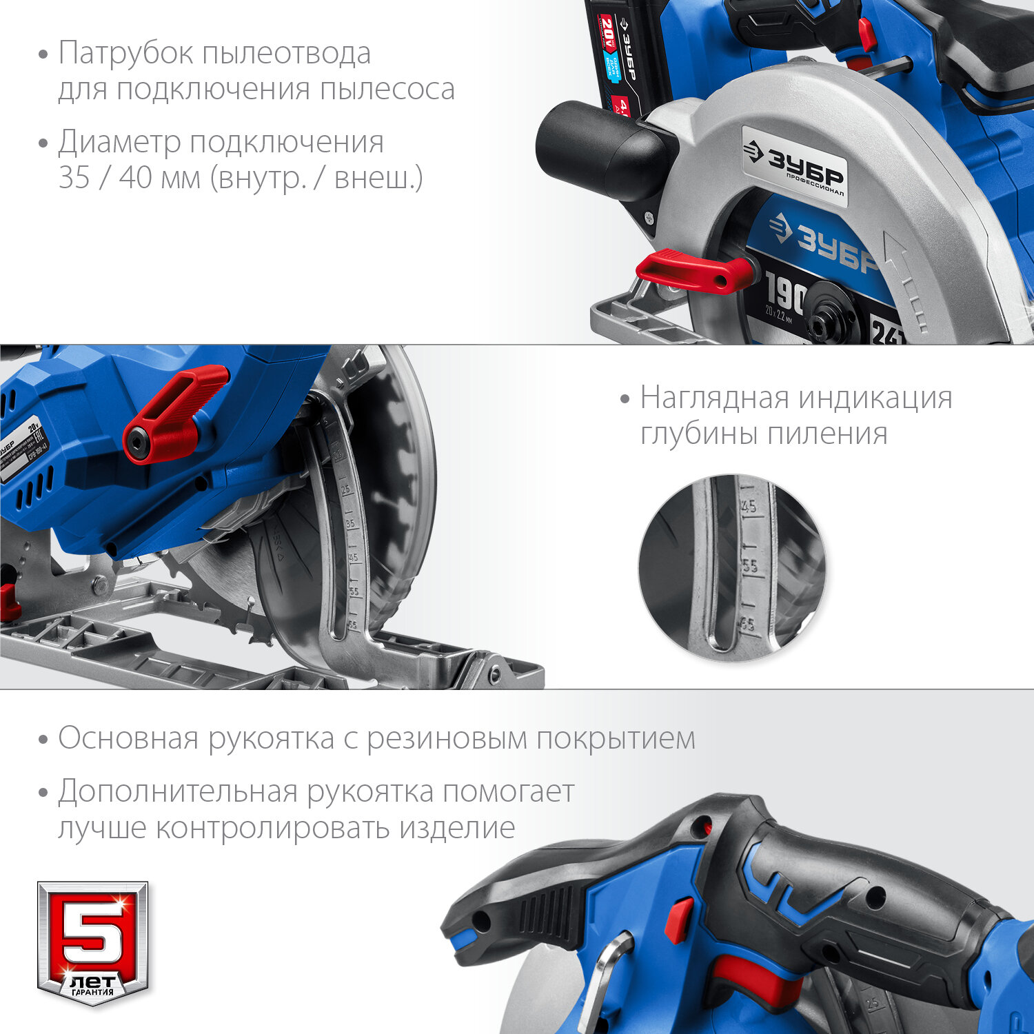 ЗУБР Т7, 20 В, d190 мм, 1 АКБ (4 А·ч), бесщеточная пила циркулярная, Профессионал (CPB-190-41) информация:
