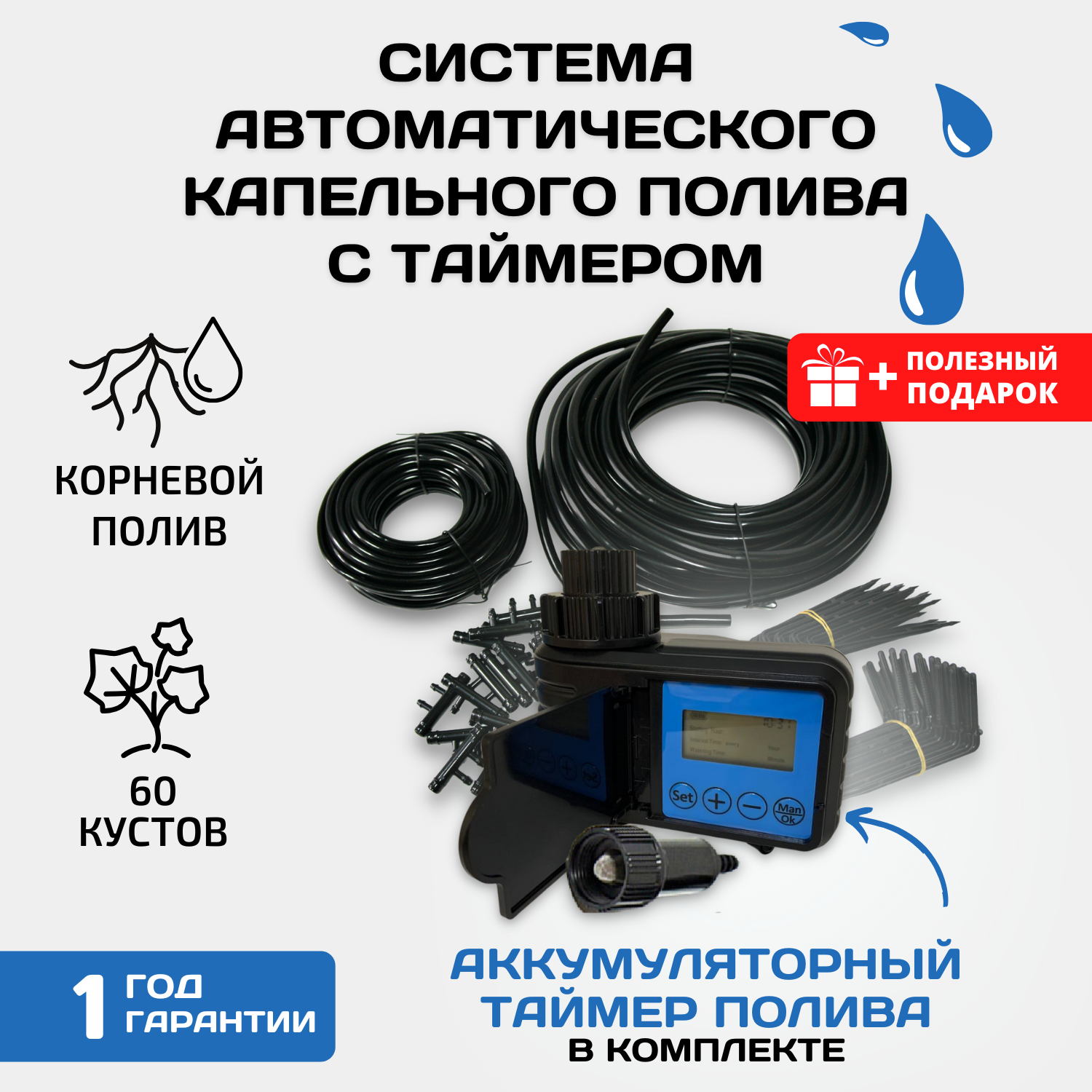 | Комплектация | Таймер шаровый автоматический - 1 шт, шланг магистральный 7/9 мм - 18 м, шланг подающий 4/6 мм - 17 м, капельницы - 60 шт, кран - 1 шт, заглушка для подающего шланга - 3 шт, малый разветвитель - 30 шт, врезка для бочки - 1 шт, разветвитель с пробкой - 1 шт, инструкция по эксплуатации - 1 шт, упаковочный короб - 1 шт. |