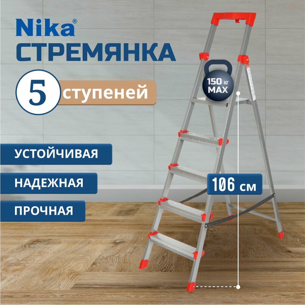 Стремянка 1 секция, 5 ступеней, сталь, 1.2 м, 150 кг, с широкой ступенью, Nika, информация:
