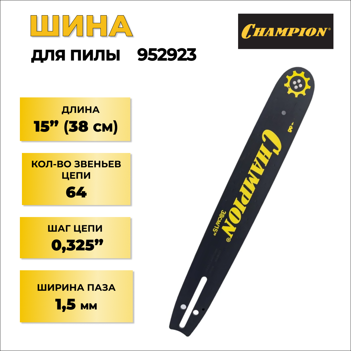 Шина Champion 952923, 15 дюймов, 64 звена, шаг цепи 0.325", ширина паза 1.5мм информация: