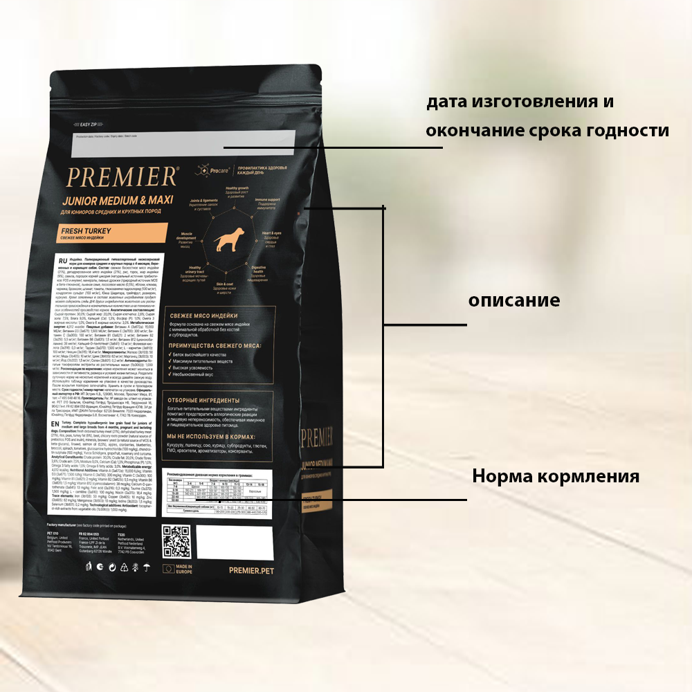Сухой корм для юниоров средних и крупных пород с 4-х месяцев, беременных и кормящих собак,10 кг Premier Dog Turkey JUNIOR Medium&Maxi, супер-премиум, гипоаллергенный информация: