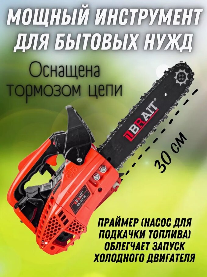 Пила цепная бензиновая BRAIT BR-2512С 1 л. с, легкий запуск, шина 30 см информация: