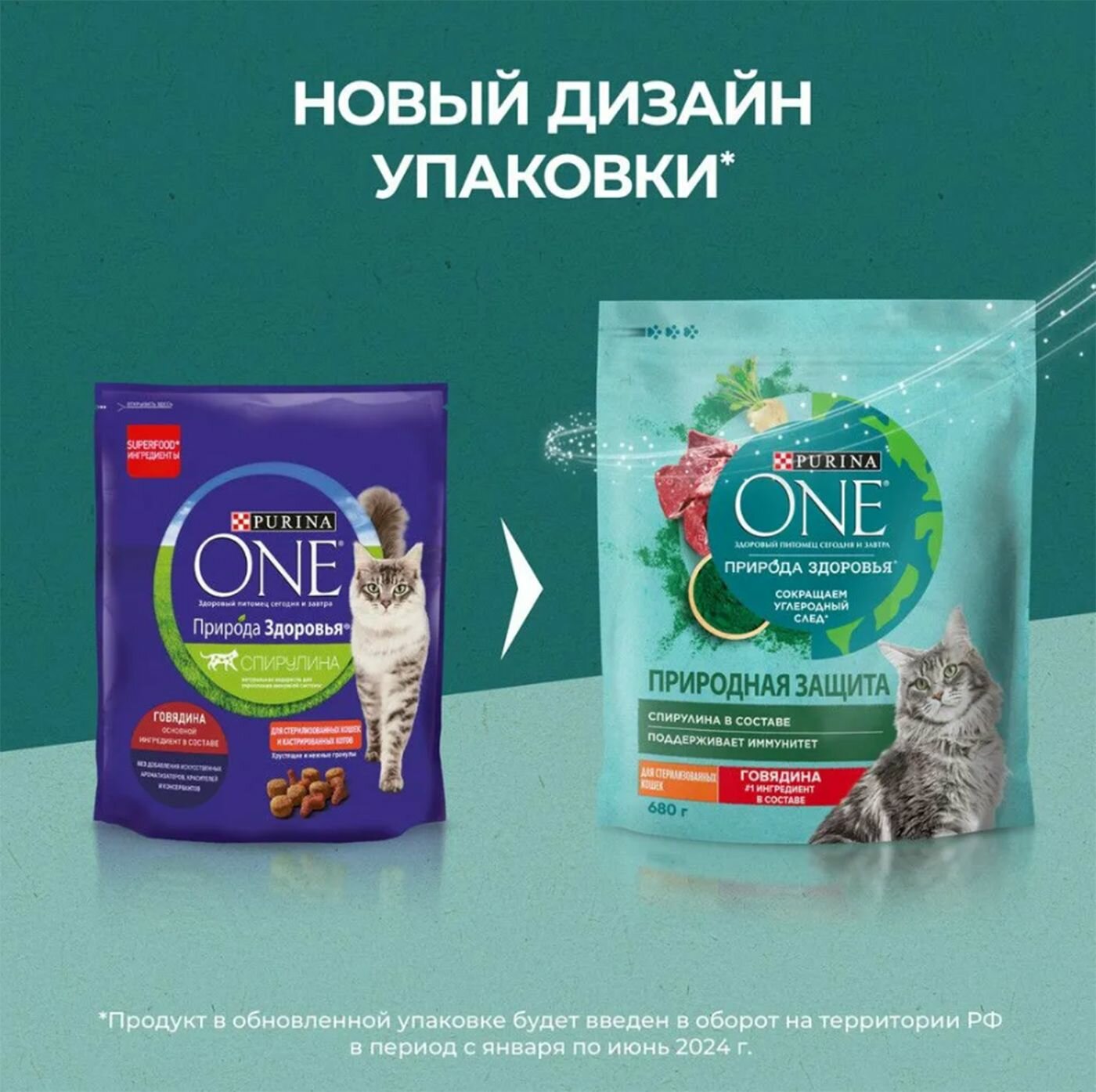 Purina One Сухой корм для стерилизованных кошек, говядина и спирулина 680гр х 2шт информация: