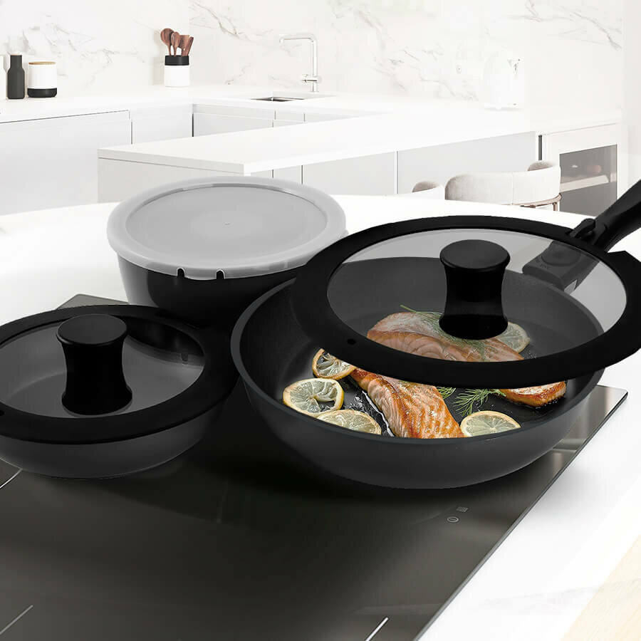 | Комплектация | ковш с крышкой размер 18 х 9 см; сковорода универсальная с крышкой размер 20 х 4,5 см; сковорода Wok с крышкой размер 26 х 7 см; съемная ручка с фиксатором на кнопке для сковородок |
