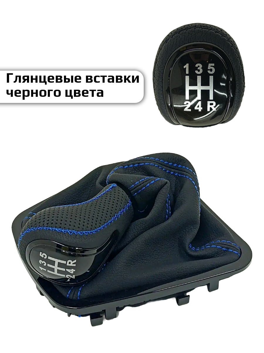 Ручка КПП с чехлом в стиле Весты на Лада Гранта, Лада Калина-2, Дацун, рамка черный лак, черный с синей строчкой информация: