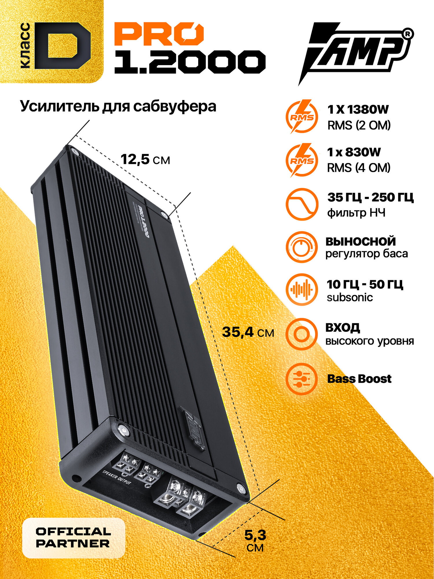 AMP PRO 1.2000 Усилитель автомобильный; одноканальный моноблок class-D; max 4000w; min 1 Ом информация: