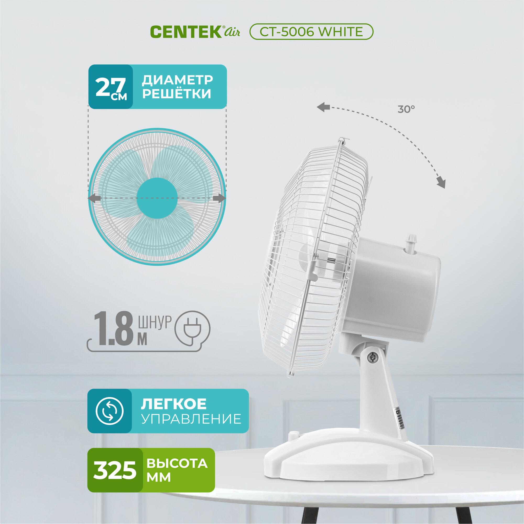 Вентилятор настольный Centek CT-5006 White, 25Вт, решетка-сетка 27см, лопасти 25 см, 2 скорости, Регулируемый наклон 0-30, Регулируемый поворот 90, Безопасная лучевая решетка