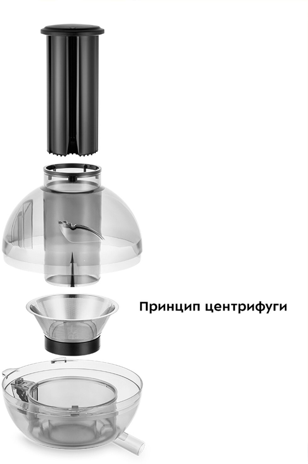 | Подробная комплектация | 1. Соковыжималка –– 1 шт. • Моторный блок — 1 шт. • Чаша — 1 шт. • Фильтр — 1 шт. • Крышка — 1 шт. 2. Толкатель — 1 шт. 3. Контейнер для сока с крышкой — 1 шт. 4. Щеточка для чистки — 1 шт. 5. Руководство по эксплуатации — 1 шт. |