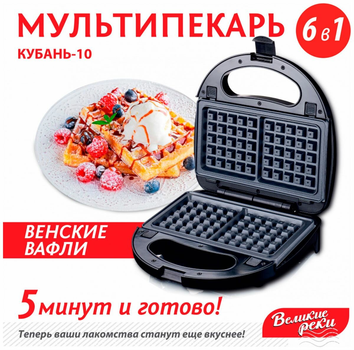 Вафельница Великие реки Кубань-10, черная, 6 в 1, съемные панели, 800 Вт информация: