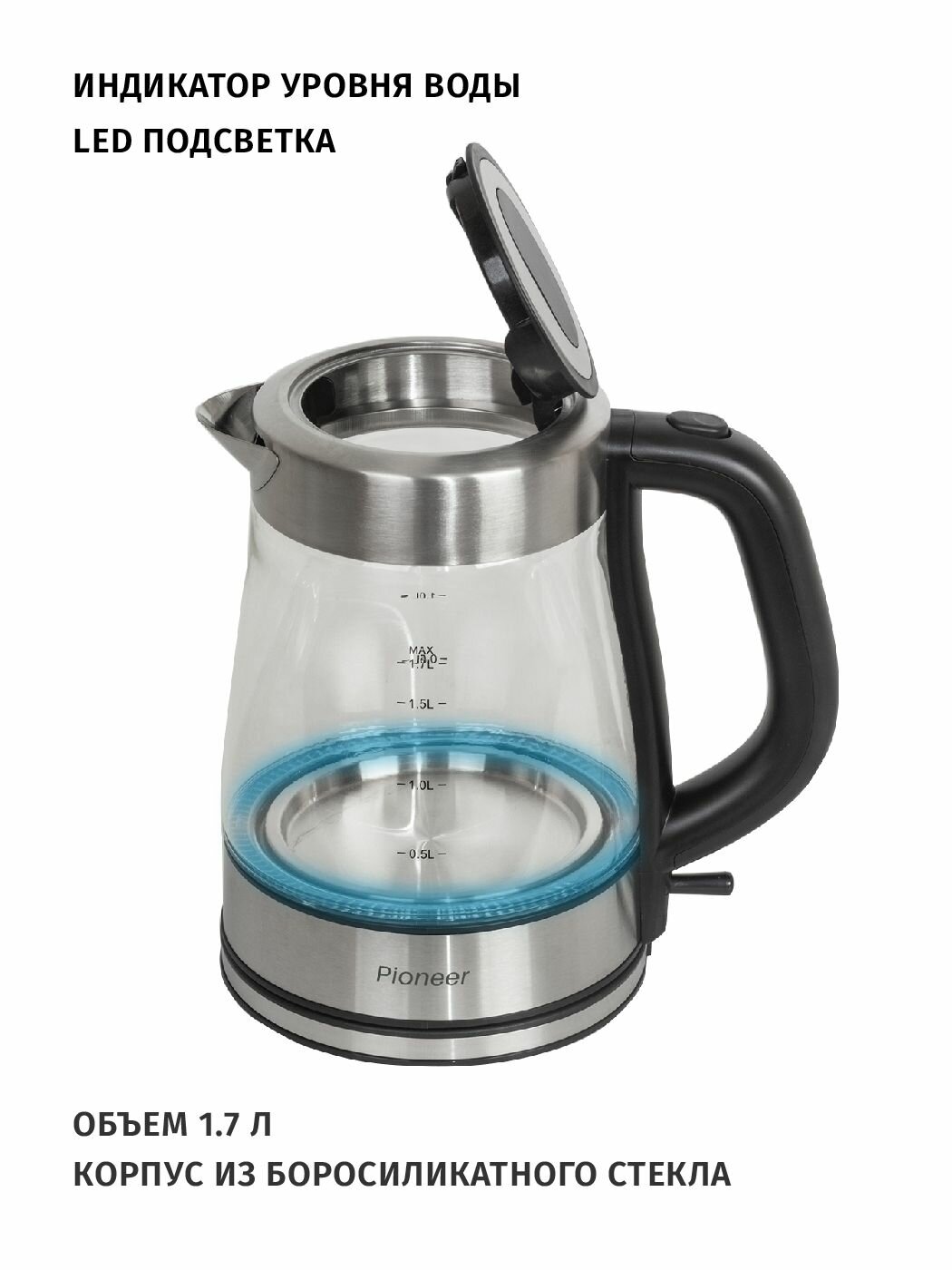 Электрический чайник Pioneer из термостойкого стекла с LED подсветкой, 1,7 л, автоотключение при закипании и снятии с базы, 2200 Вт