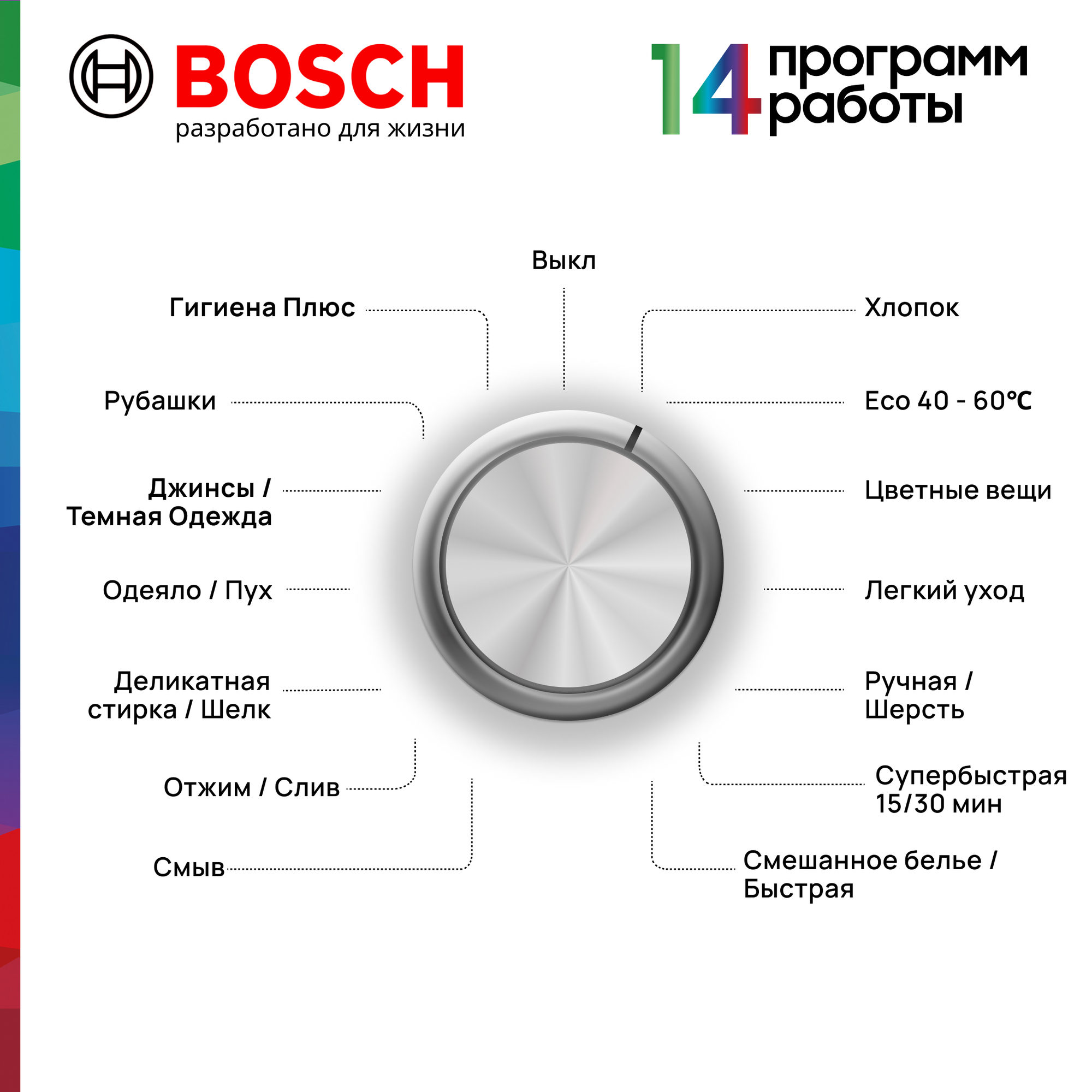 Стиральная машина Bosch WAN2420XME с загрузкой 8кг, инверторный двигатель, отсрочка запуска, дозагрузка белья, белая информация: