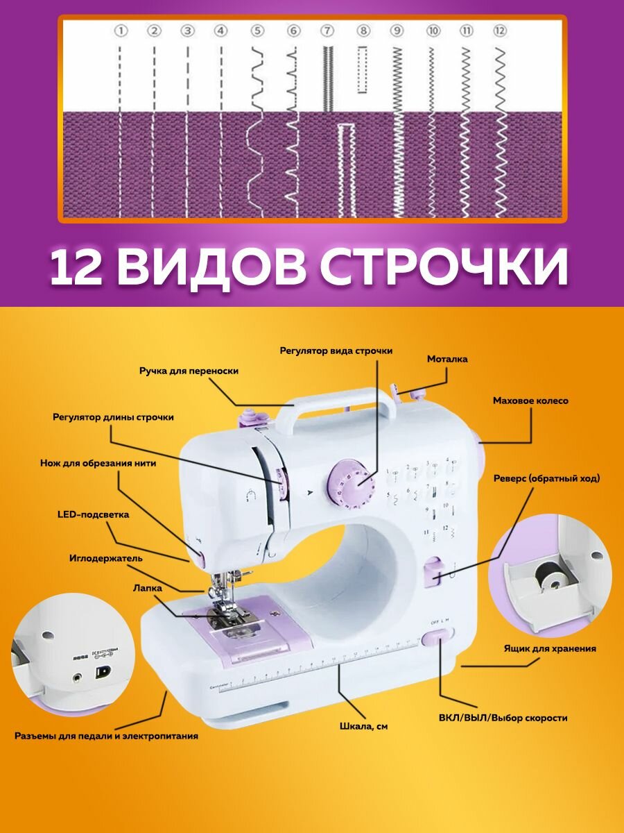 Портативная швейная машинка электрическая от сети и батареек Classmark WJ23071901, реверс, регулировка скорости, нитевдеватель и подсветка, полуавтомат, 350 стежков/мин, 12 видов строчек информация: