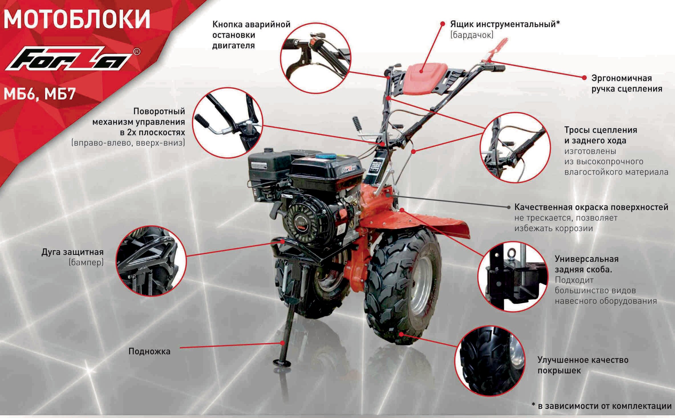 10 цен на Мотоблок с дисковым сцеплением Forza МБ7-902 с пониж, 3впер+1наз и ВОМ (9л. с, широкие колеса 19x7x8)/собран в России