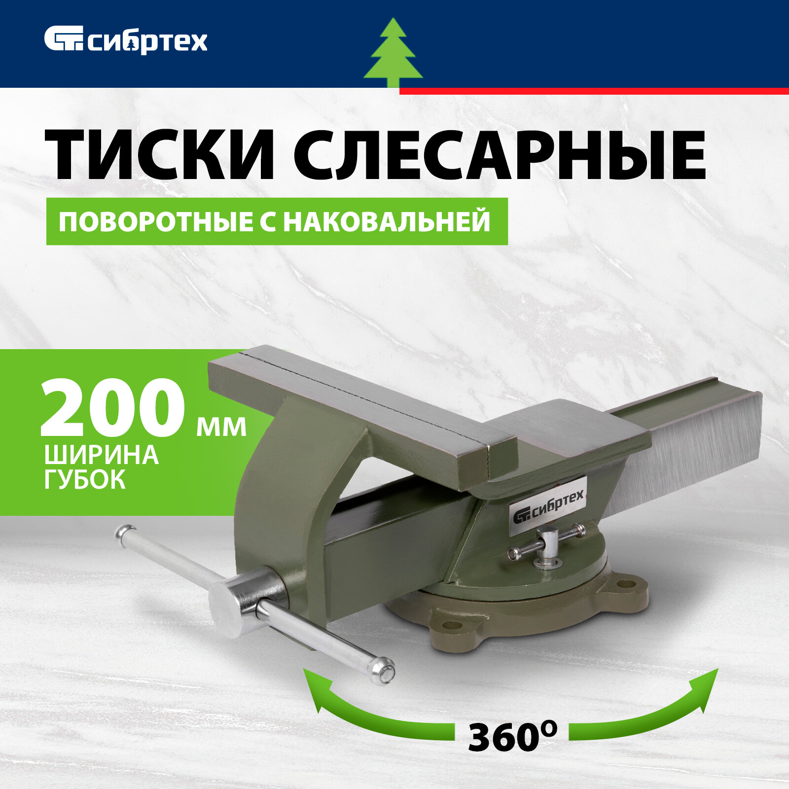 Тиски слесарные поворотные Сибртех, 200 мм ширина губок и 200 мм рабочий ход, стальной корпус и чугунное основание 18621 информация: