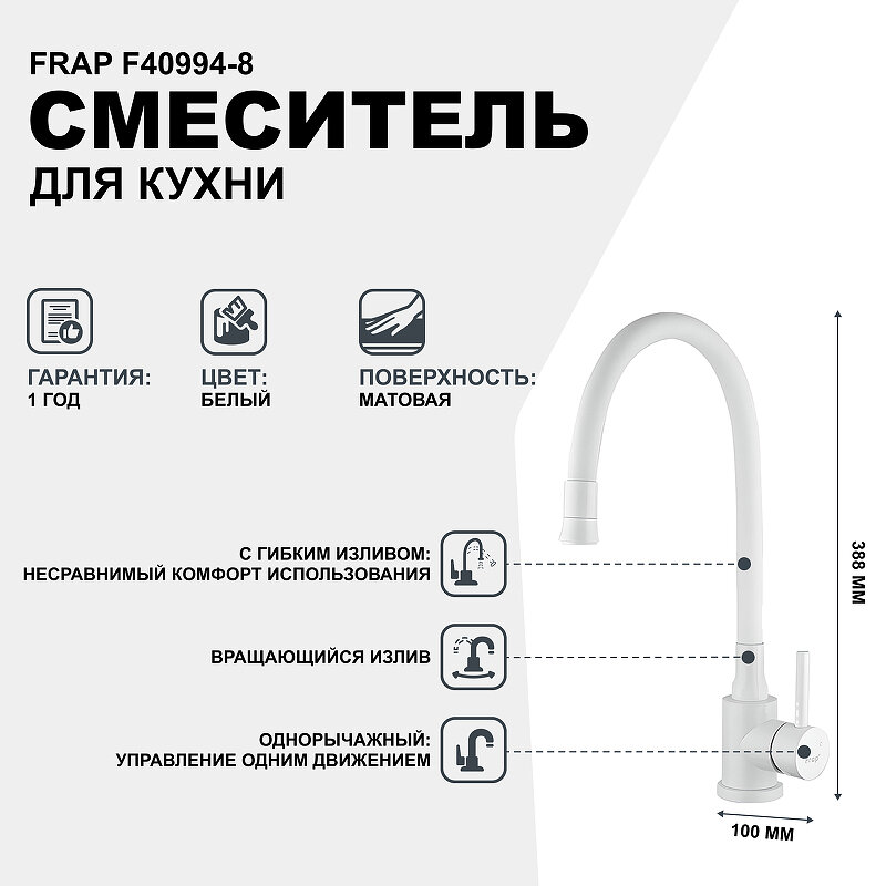 Смеситель для кухни Frap F40994-8 Белый информация: