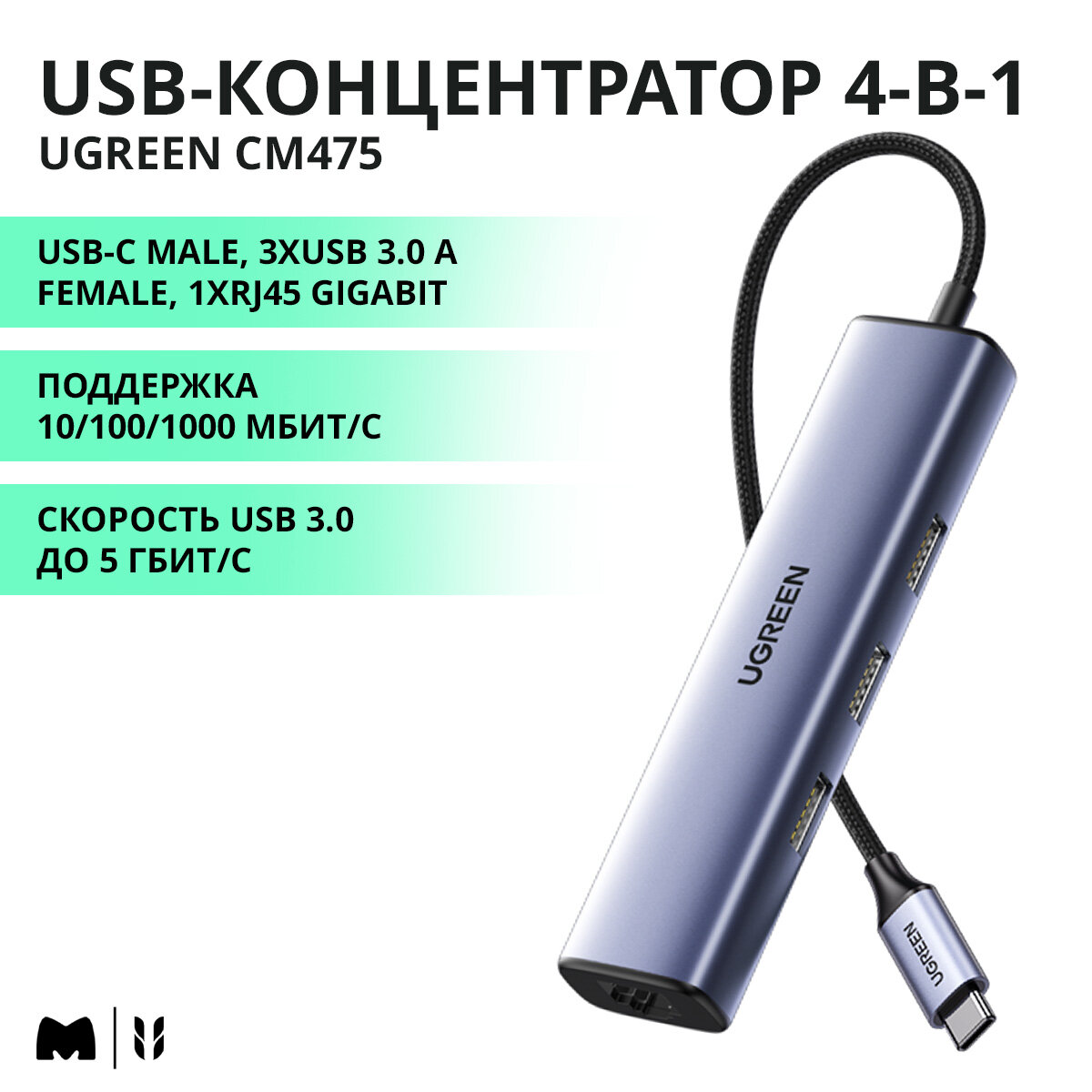 10 цен на USB-концентратор UGREEN CM475 USB-C to 3хUSB3.0 Hub+RJ45 Ethernet Adapter, цвет серый (60600)