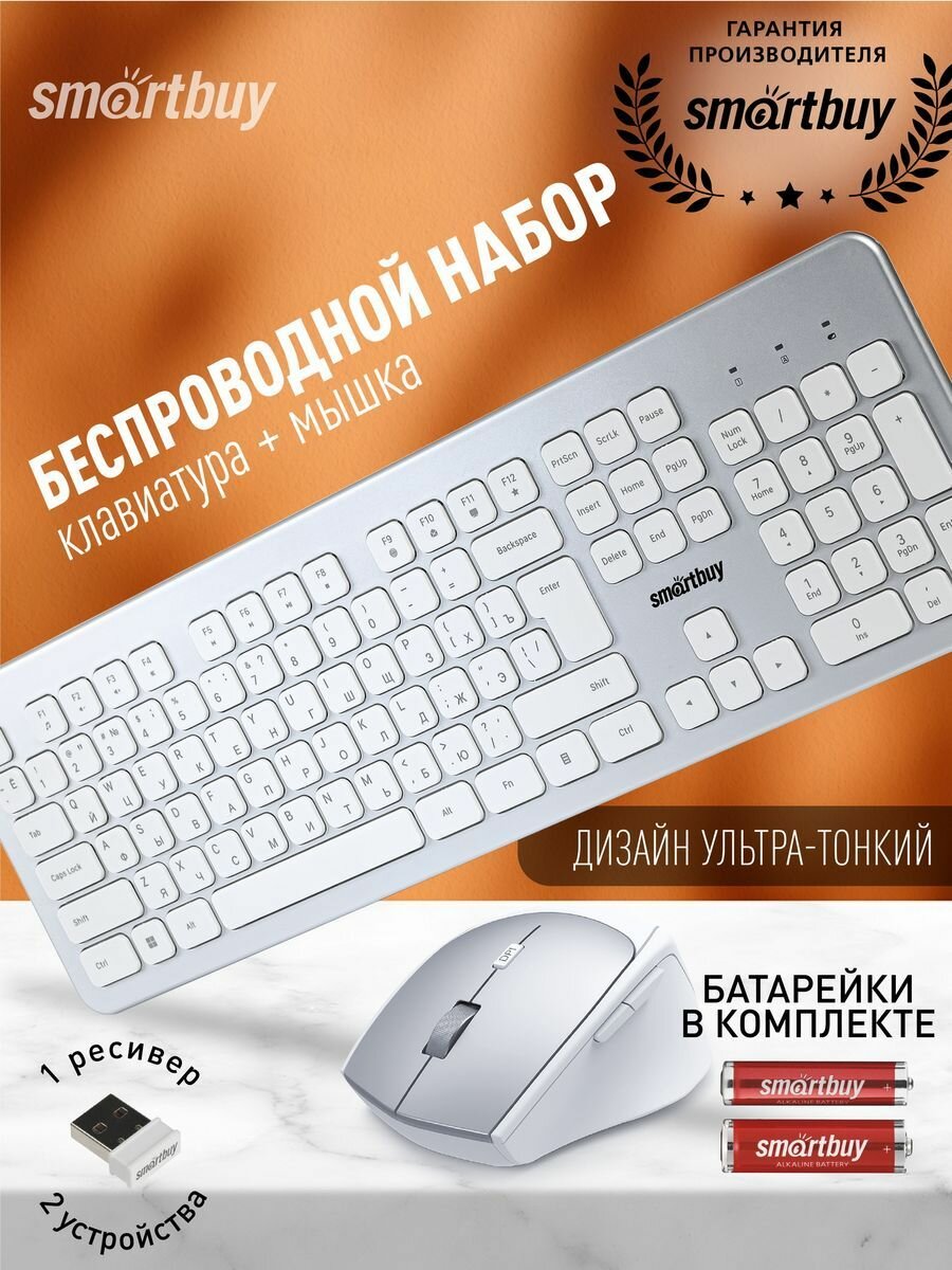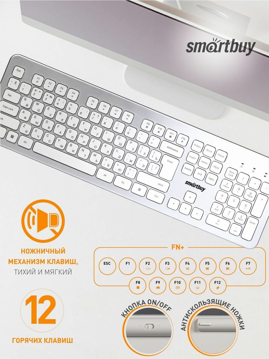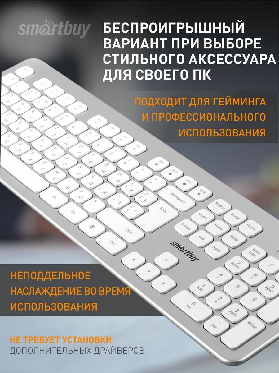 Комплект клавиатура + мышь SmartBuy 233616AG-SW, беспроводной, с нано-приемником, 2400 DPI, серебристый информация: