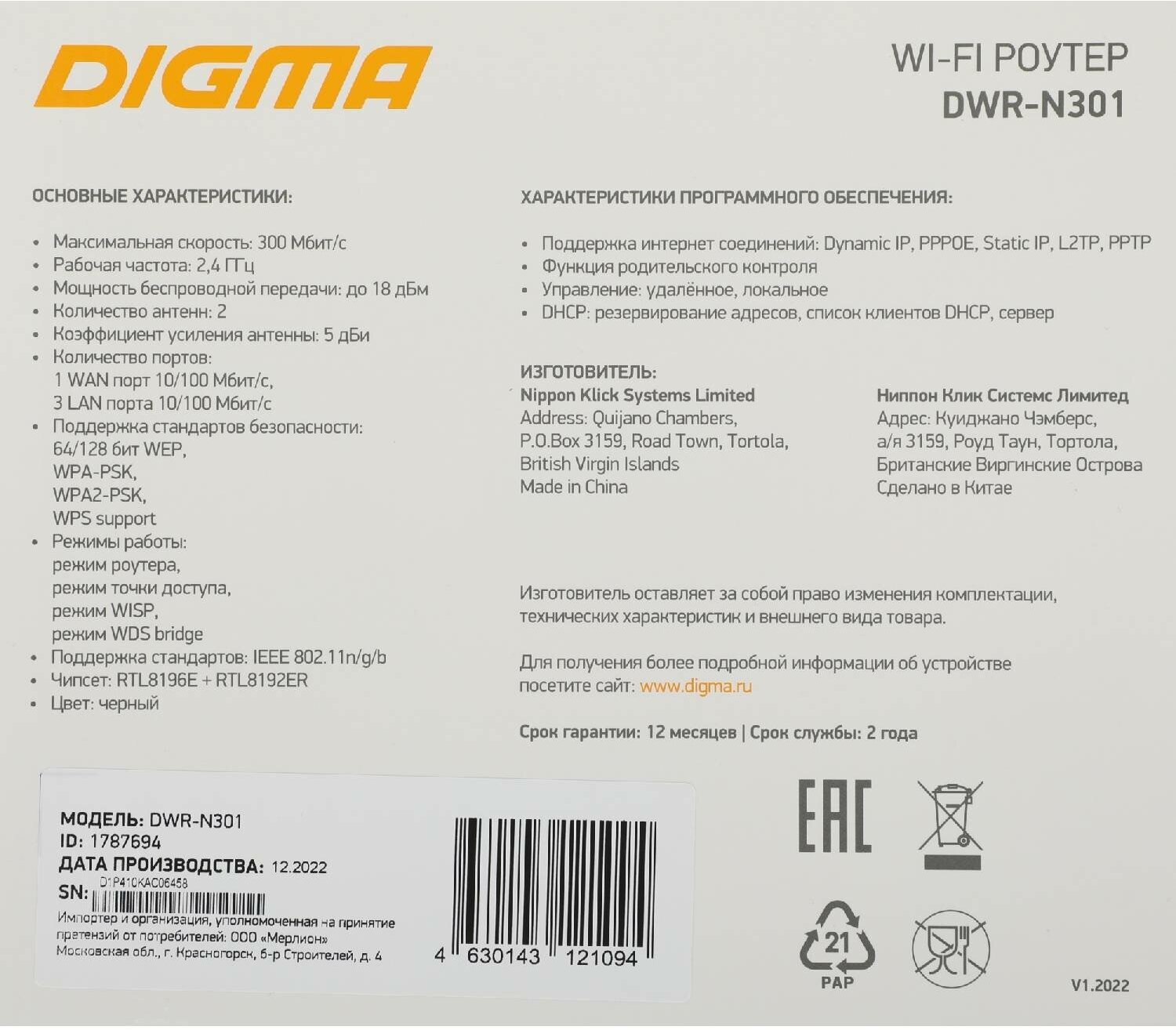 Маршрутизатор беспроводной Digma DWR-N301 черный информация: