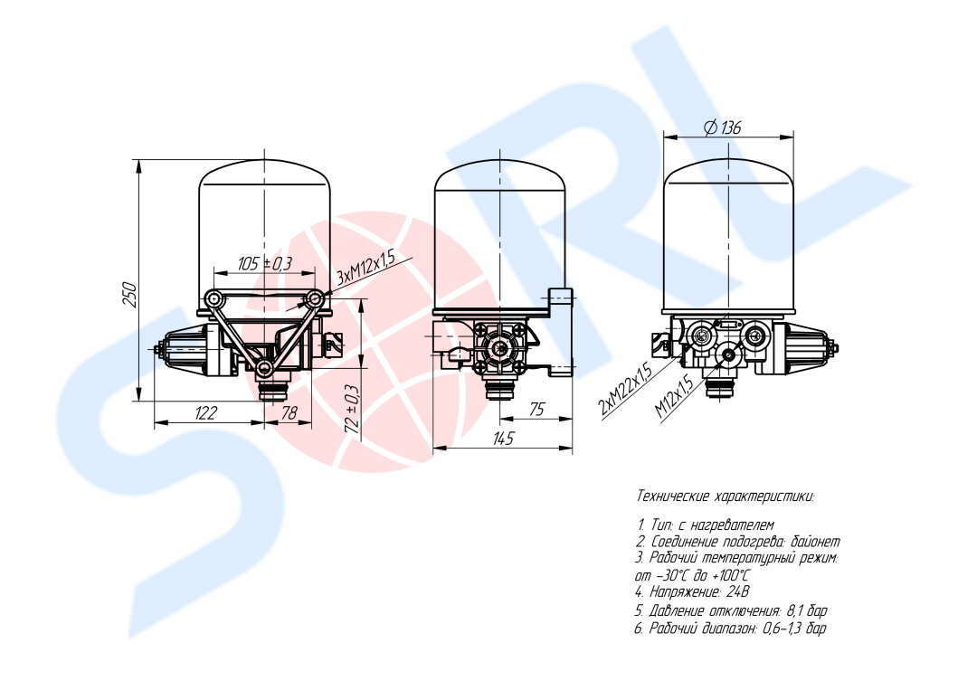 Осушитель воздуха 24V 8,1bar с нагревателем 3 выхода КАМАЗ 5460/6460/6520 35110031370 (SORL) информация: