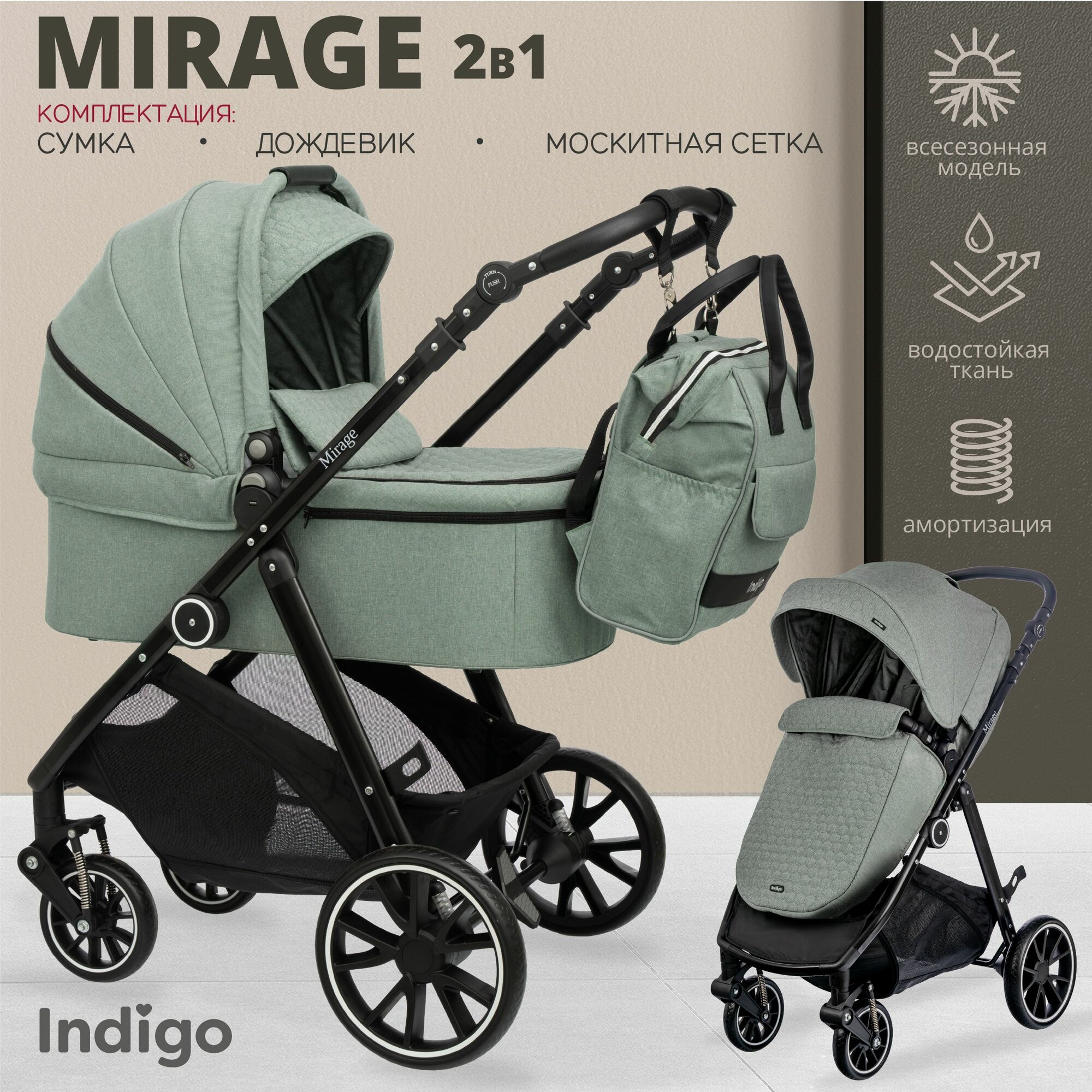 Отзывы на Коляска детская универсальная 2 в 1 Indigo Mirage для новорожденных, прогулочная, всесезонная, с реверсивным блоком, оливковый