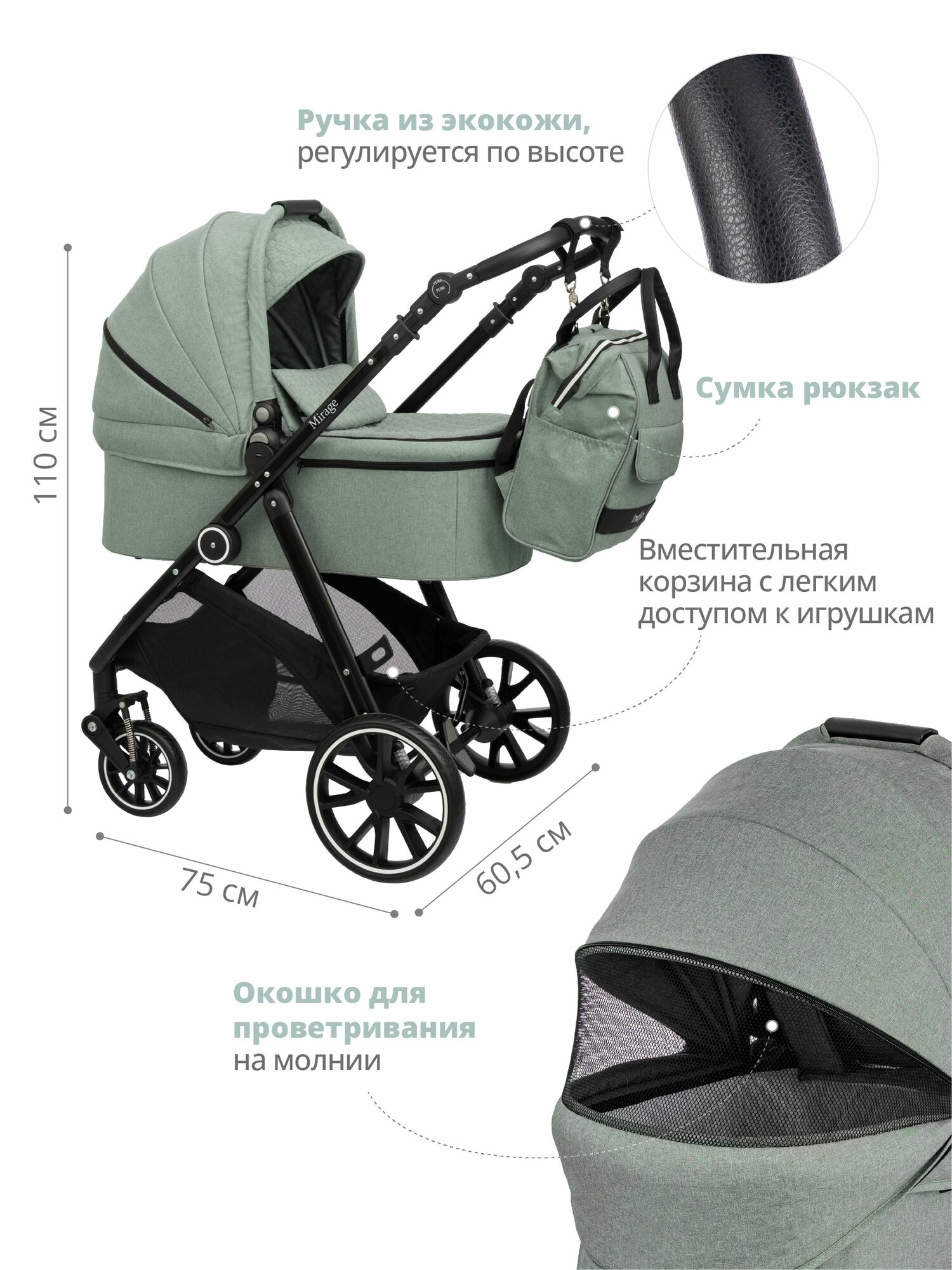 | Дополнительная информация | Регулируемая ручка, Положение для сна, Фиксация передних колес |