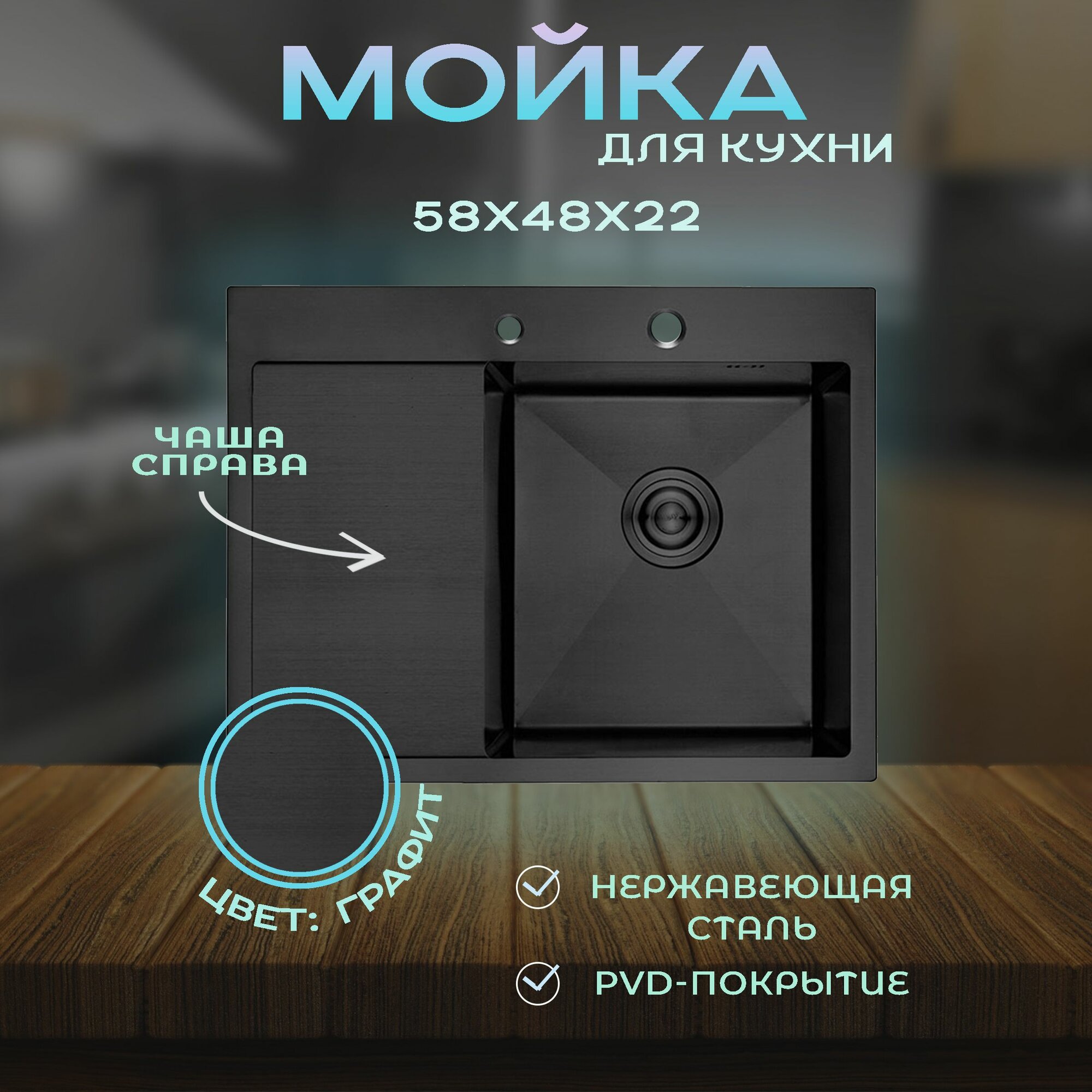 Мойка для кухни Премиум класса 58х48 Графит, нержавеющая врезная, чаша справа, 3 мм толщина, выпуск 3 1/2, с сифоном