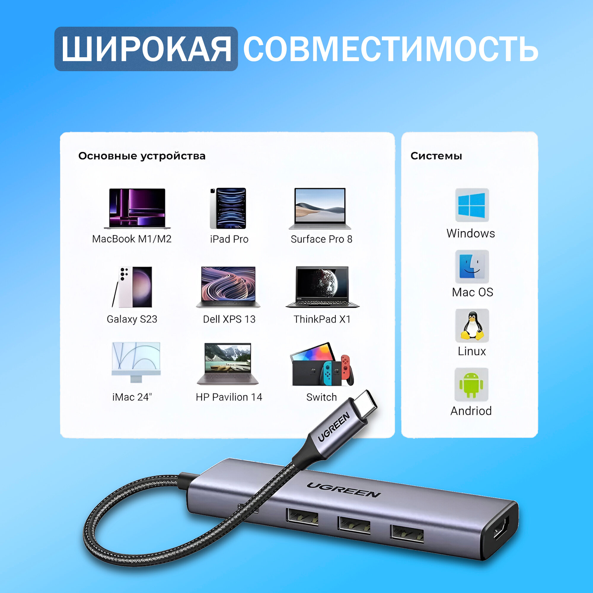 10 цен на Адаптер-хаб UGREEN CM511 (15596) 5 портов, USB-C HDMI 4K 30 Гц / 3хUSB-A 3.0 / PD зарядка 100Вт, Silver