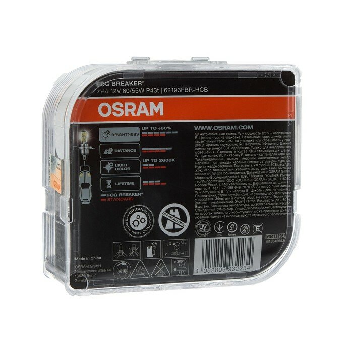 Лампа автомобильная Osram, H4, 12 В, 60/55 Вт, FOG BREAKER, набор 2 шт, 62193FBR-DuoBox информация: