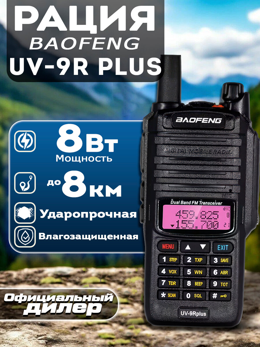 Рация Baofeng UV-9R Plus, мощность 8W, 128 каналов, 1800 мАч, IP67 информация: