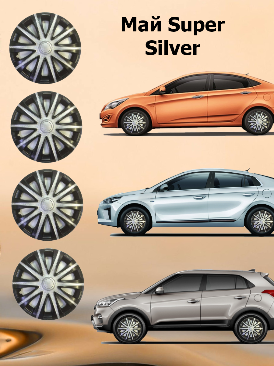 Колпаки на колеса R15 Май Super Silver, цвет серебристый/черный, 4 штуки в комплекте информация: